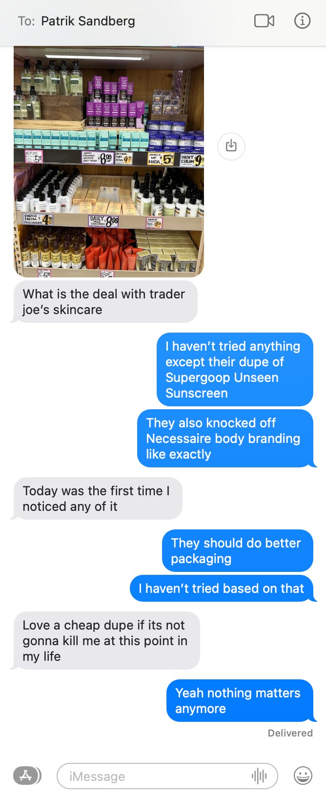 Hey, Alexis! Re, TJs: Whenever we report out and test skincare for a NYT Wirecutter guide, we include Trader Joe’s. (You know me, lol, but for those who don’t: I edit the beauty vertical at Wirecutter & we have guides to the best moisturizer, vitamin c serum, cleanser, etc.) So far, the only TJ skincare we recommend is their retinol night serum. Testers loved the silky texture—and the price, obvi. Anyway, love that you’re doing a newsletter…keep ‘em coming!